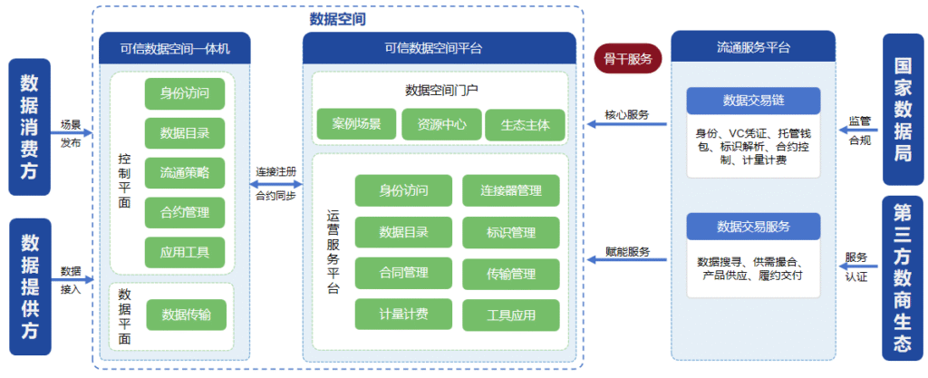 - 场景实现:提供基于国际数据空间IDS RAM 4.0标准的全体系化产品,包括数据空间枢纽平台、运营服务平台和可信数据空间链接节点等。通过标准化与互操作性、安全合规处理、数据访问和使用控制以及审计追溯等四大核心能力,结合应用场景套件,助力数据交易所构建高效流通与价值释放的数据基础设施。