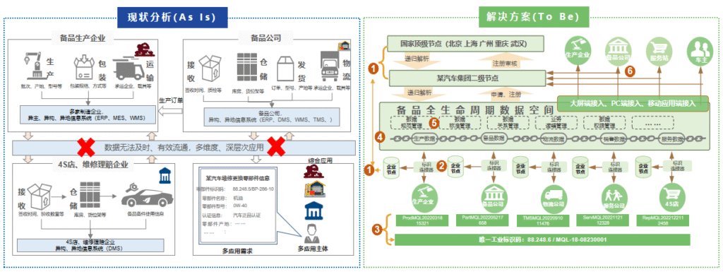 - 应用现状:某汽车集团备品备件在生产、流通、4S店/维修网点使用等环节中,因数据标准不一致,接口不统一、系统改造难度大等原因,导致备品备件使用状态不透明、闲置超期难追踪、副厂件混用等问题,致使备品服务质量提升难,营销市场拓展慢。